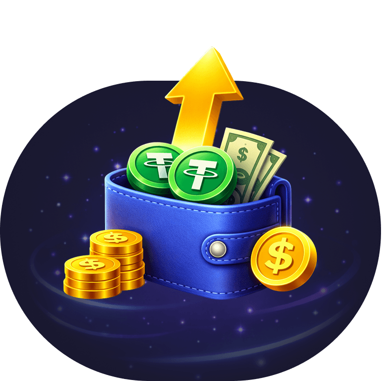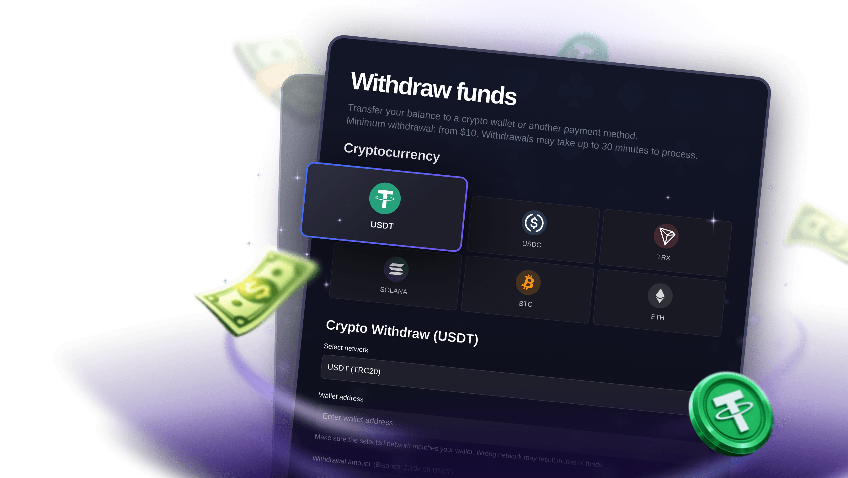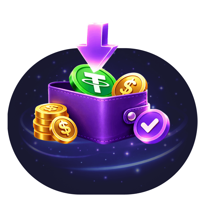 Top up in seconds using supported crypto or fiat methods. Your funds land as a clean USDT balance, so you can join tables without friction.