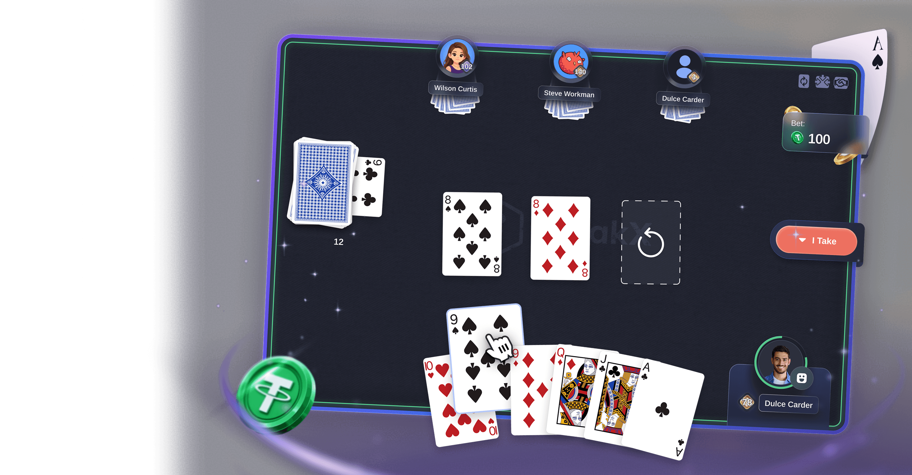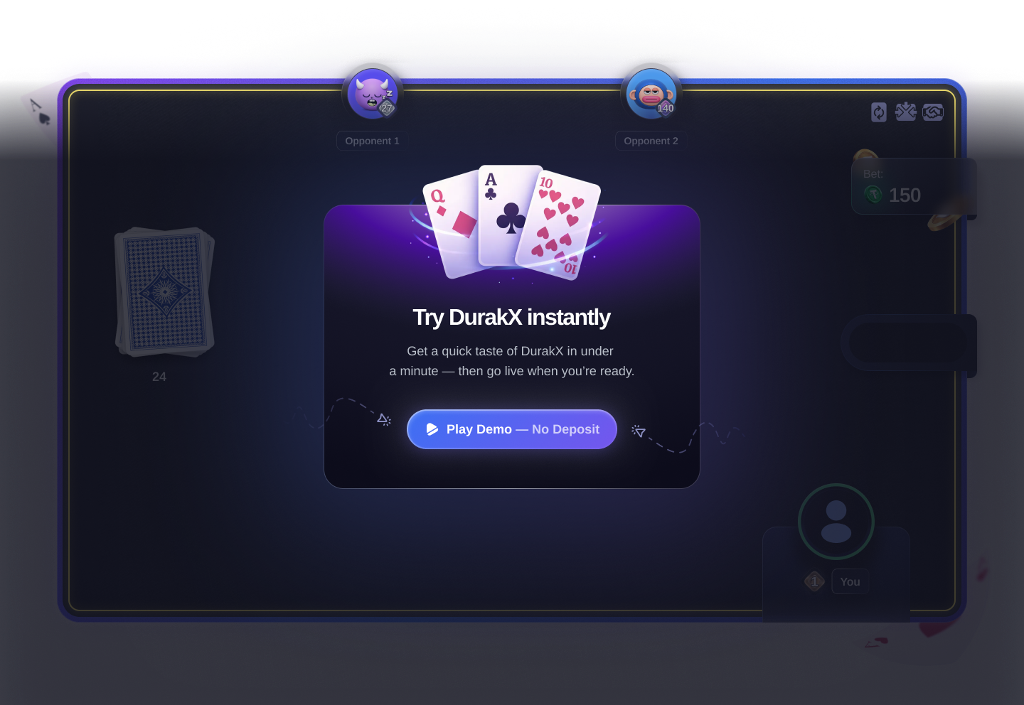 DurakX uses USDT as the in-game currency for clean stakes and clear tracking — while letting you deposit and withdraw via crypto or fiat options.