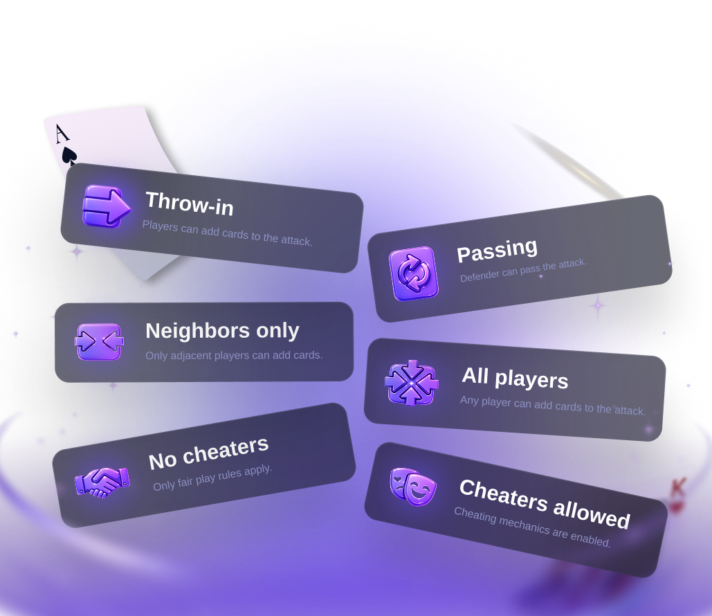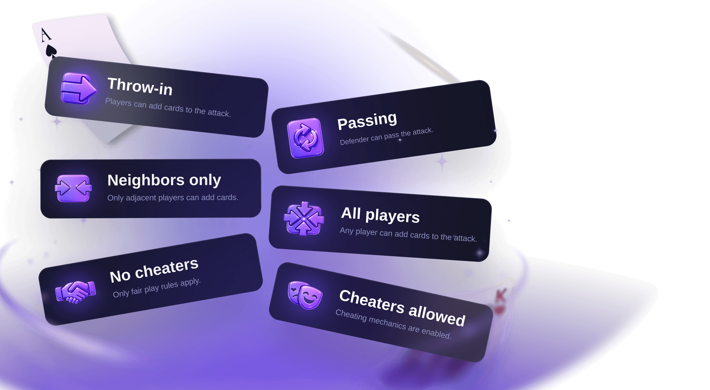Toggle throw-ins, transfers, and other variants. Pick 2–6 players and 24/36/52-card decks. Switch modes anytime.