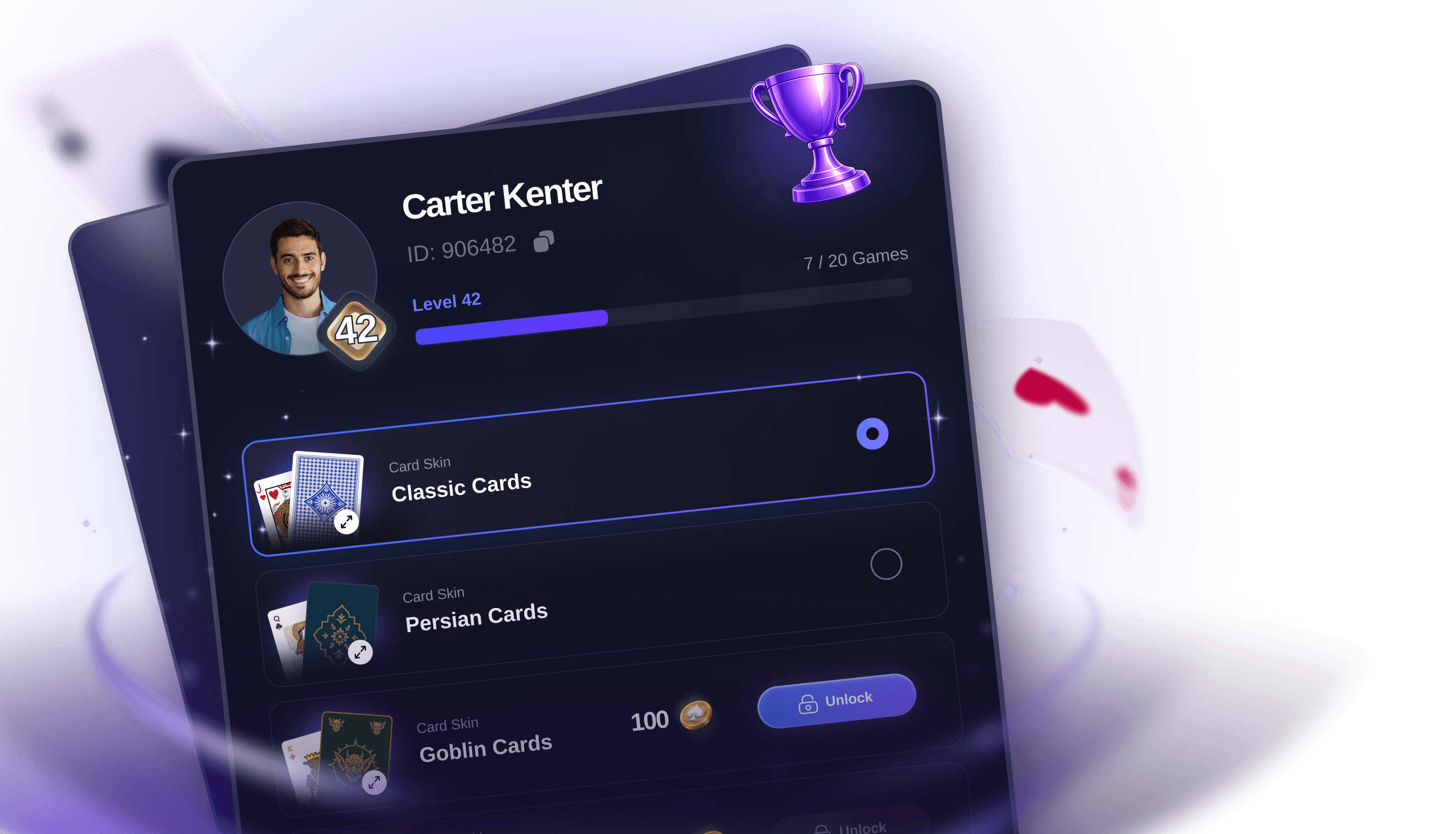 Win matches, unlock levels, and show your status at the table. Earn in-game point to unlock exclusive skins for cards and emojis.